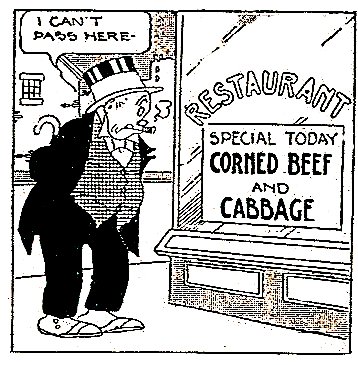 To wspaniale, że odpowiedzieliście twierdząco. Otóż nawiązuje ona do… postaci komiksowej. Jiggs był głównym bohaterem popularnego komiksu „Bringing Up Father” stworzonego przez George’a McManusa i wydawanego przez prawie sto lat (1913-2000). To amerykańsko – irlandzki imigrant, który wygrał milion dolarów, ale nie za bardzo chciał zmieniać swój dotychczasowy styl życia. Zgoła odmienne plany miała jego żona, która aspirowała do klasy wyższej. Punktem spornym między nimi była między innymi peklowana wołowina z kapustą, którą Pan Jiggs bardzo lubił, ale jako symbol taniego, ludowego posiłku została wykreślona z domowego menu przez jego żonę. I tak w tajemnicy przed nią Jiggs nadal jadał swój ulubiony posiłek, tyle że w pobliskiej restauracji.