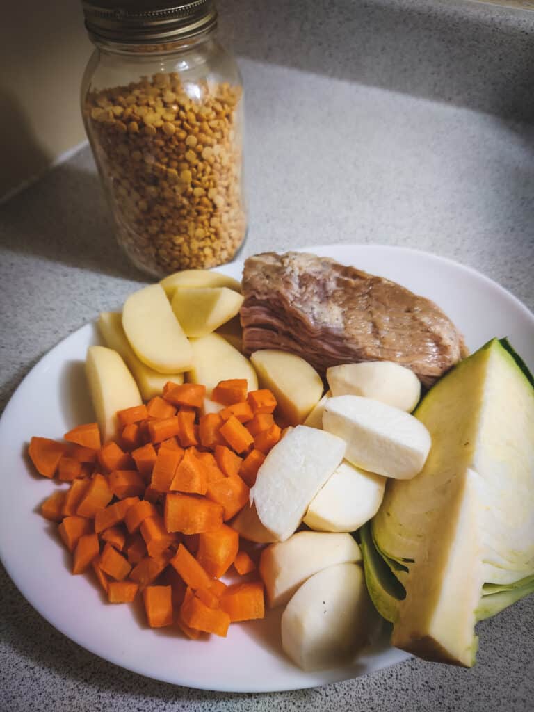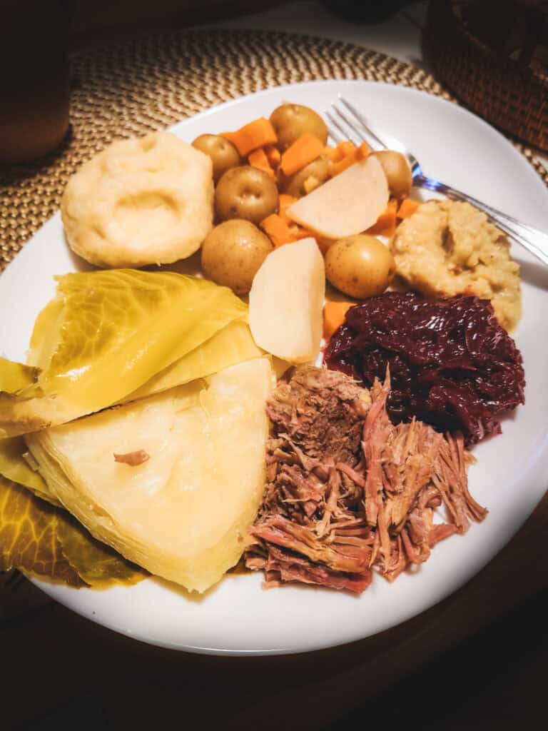 Jiggs Dinner składa się z peklowanej wołowiny, rzepy, kapusty, ziemniaków, marchwi, puddingu grochowego i „pieroga bez farszu”. Korzystałam z tego przepisu, choć wersji jest wiele jak to zwykle bywa z daniami, których przygotowanie jest pewnego rodzaju rodzinnym rytuałem, przekazywanym z pokolenia na pokolenie. O dziwo smakowało to dobrze, a moje zdziwienie wynika z faktu, że w przepisie nie było żadnych przypraw.