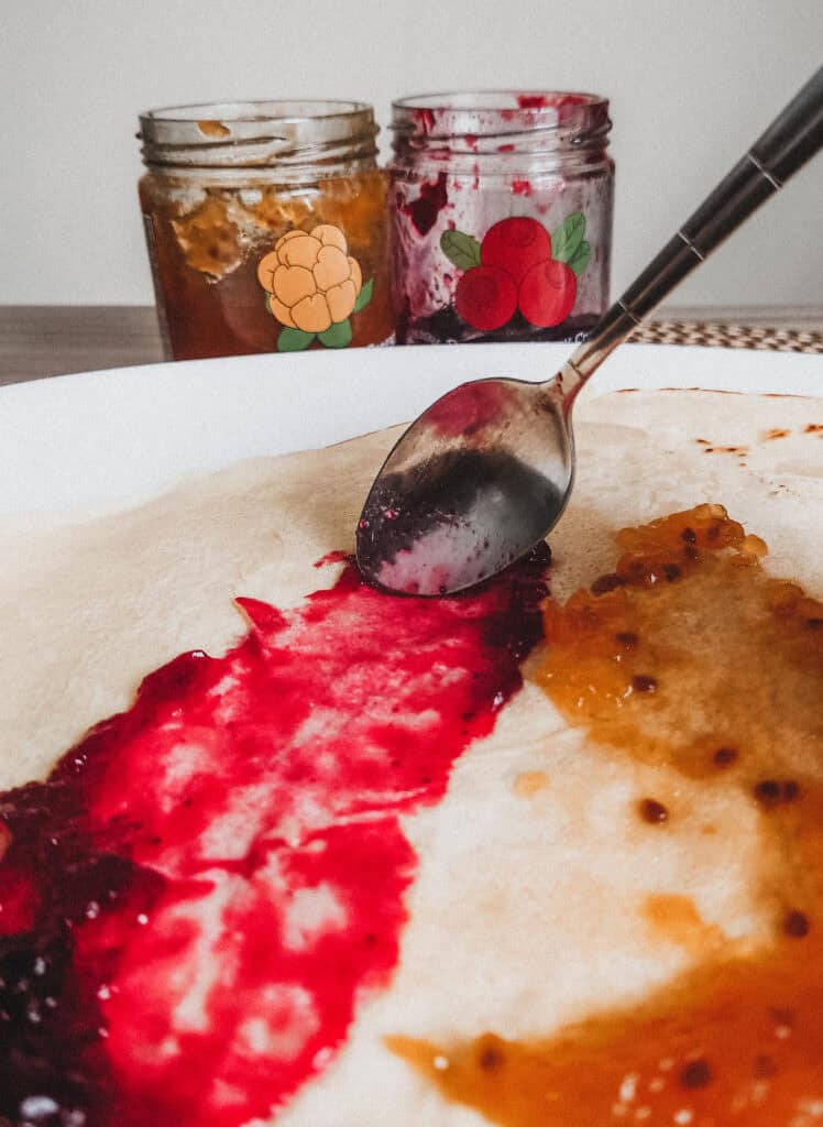 Kupiliśmy parę słoiczków dżemu od lokalnej firmy Dark Tickle Company (można je znaleźć w praktycznie każdym sklepie z pamiątkami) i spróbowaliśmy z naleśnikami. Dżem z partridgeberry jest przepyszny. Do śniadania lub deseru można także dodać świeże owoce.